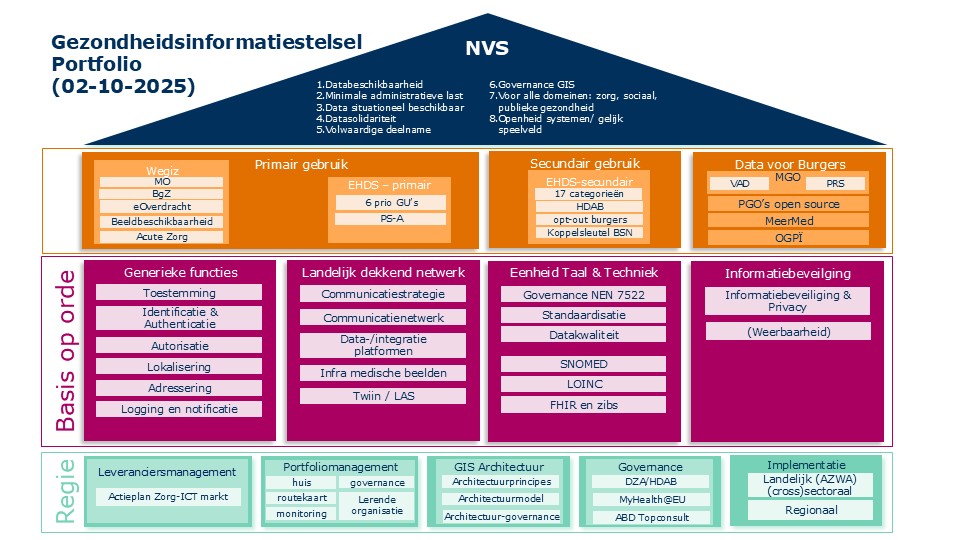 Voor een herkenbaar overzicht zijn de landelijke programma’s ingedeeld volgens het Portfoliohuis uit de Nationale Visie Gezondheidsinformatiestelsel (GIS) van het Ministerie van VWS. Klik in het portfoliohuis of op een van onderstaande programmalijnen voor een detailoverzicht van alle bijbehorende programma’s.